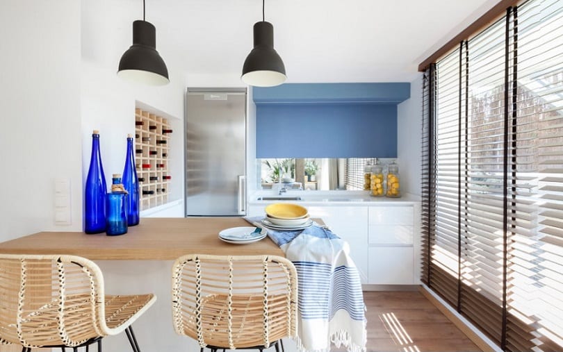 También llamo tu atención sobre el tándem perfecto que forman la alfombra y las persianas venecianas de lamas blancas con cinta decorativa.