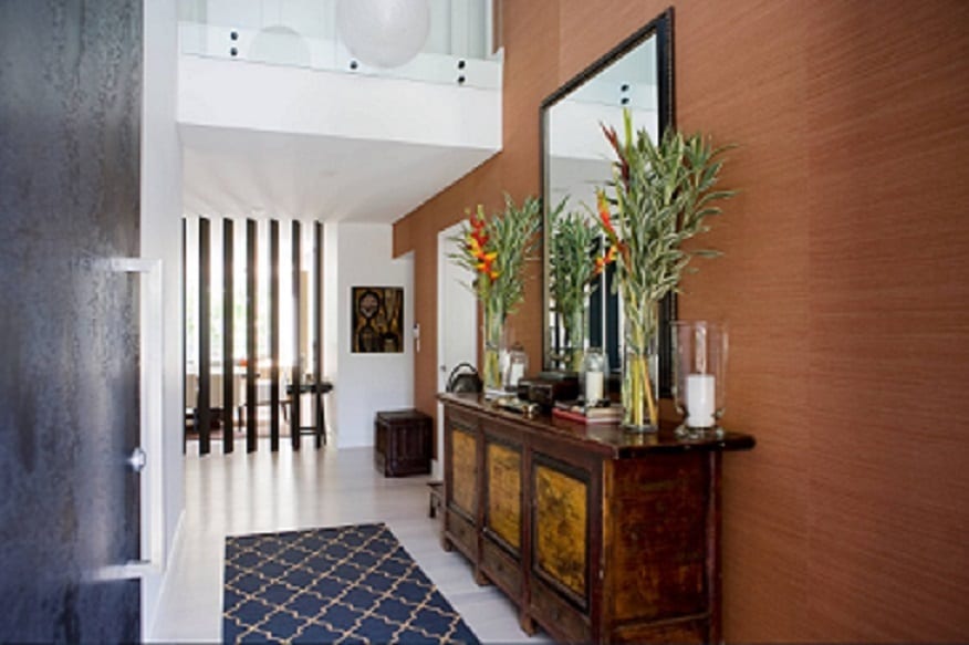A mí me encanta el efecto del papel pintado de fibras naturales para decorar recibidores, ya que no recarga nada el ambiente pero aporta un plus estético por su rica textura. Además, constituye un fondo perfecto para colocar sobre él fotografías, espejos u otro tipo de adornos.